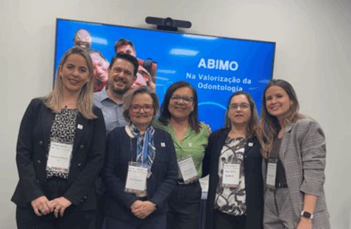 Na fotografia: Pamela de Oliveira (Kulzer), Alexandre Nardi (FAMI e ABNT), Liliana Donatelli (Cristófoli e ADS), Simone e Ana Lúcia (SOBECC) e Larissa Gomes (ABIMO).