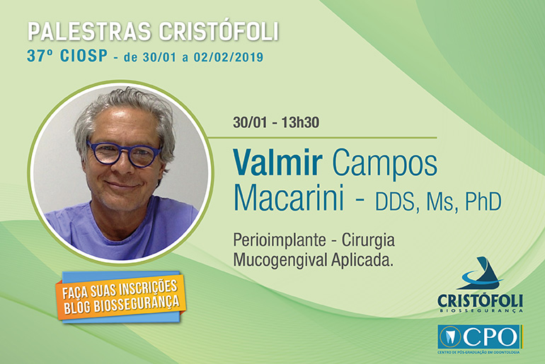 A palestra Perioimplante – Cirurgia mucogengival aplicada será ministrada por Valmir Macarini, DDS, Ms, PhD em nosso estande no CIOSP 2019. Em uma parceria com o CPO de Bauru, a Cristófoli recebe o ilustre professor, que é Mestre em Periodontia, FOA-UNESP, Araçatuba-SP, Especialista em Endodontia, FOB-USP, Bauru-SP, Doutor em Periodontia, FOA-UNESP, Araçatuba-SP e
